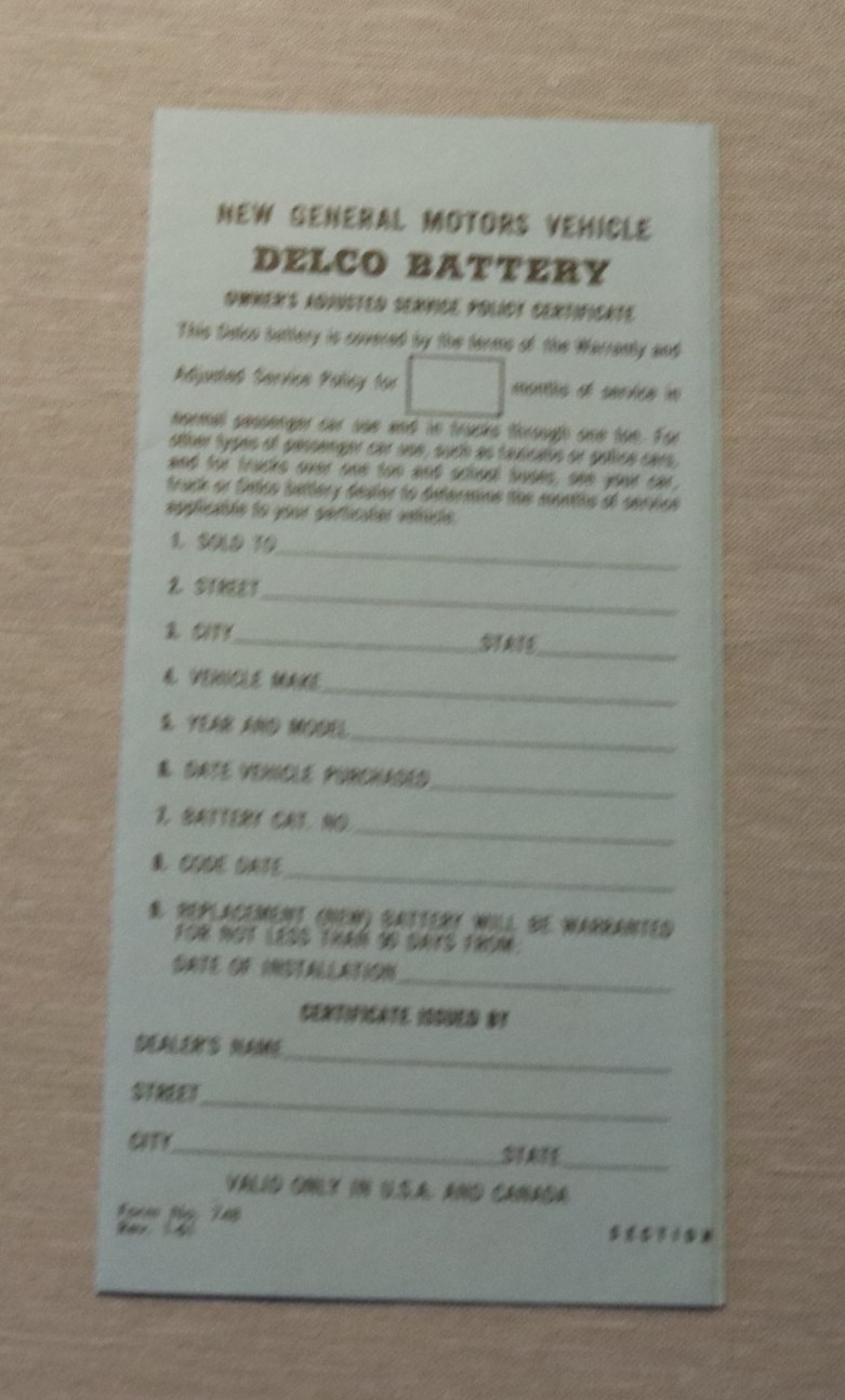 Delco Battery Owners Certificate