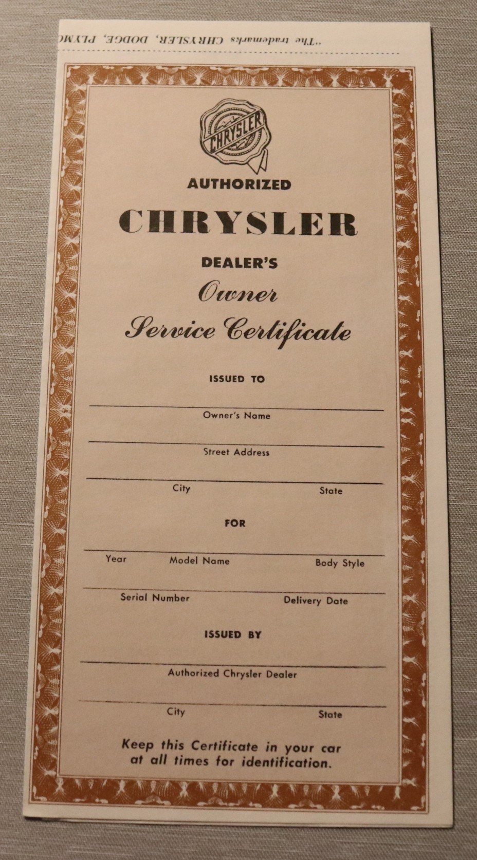 Owner Service Certificate Chrysler 1955-60