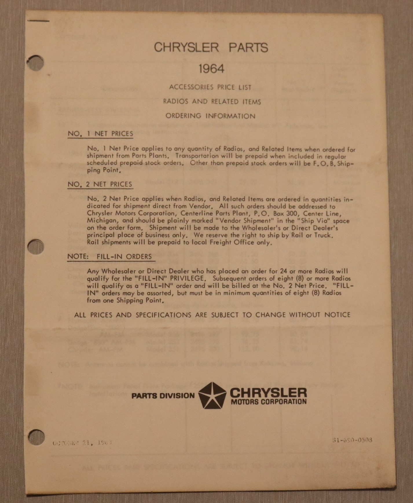 1964 Mopar Optionsprislista
