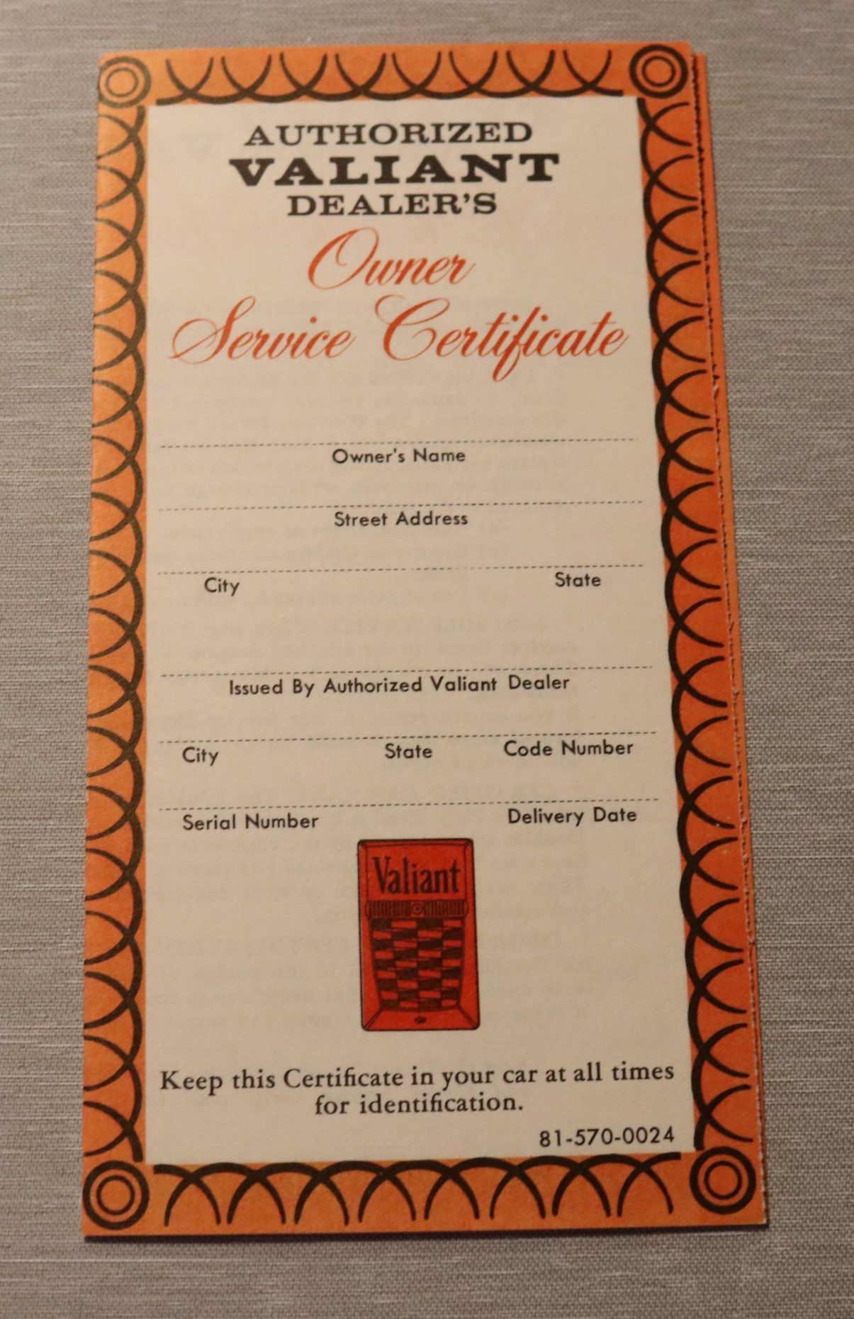 Owners Service Certificate 1960-66 Valiant